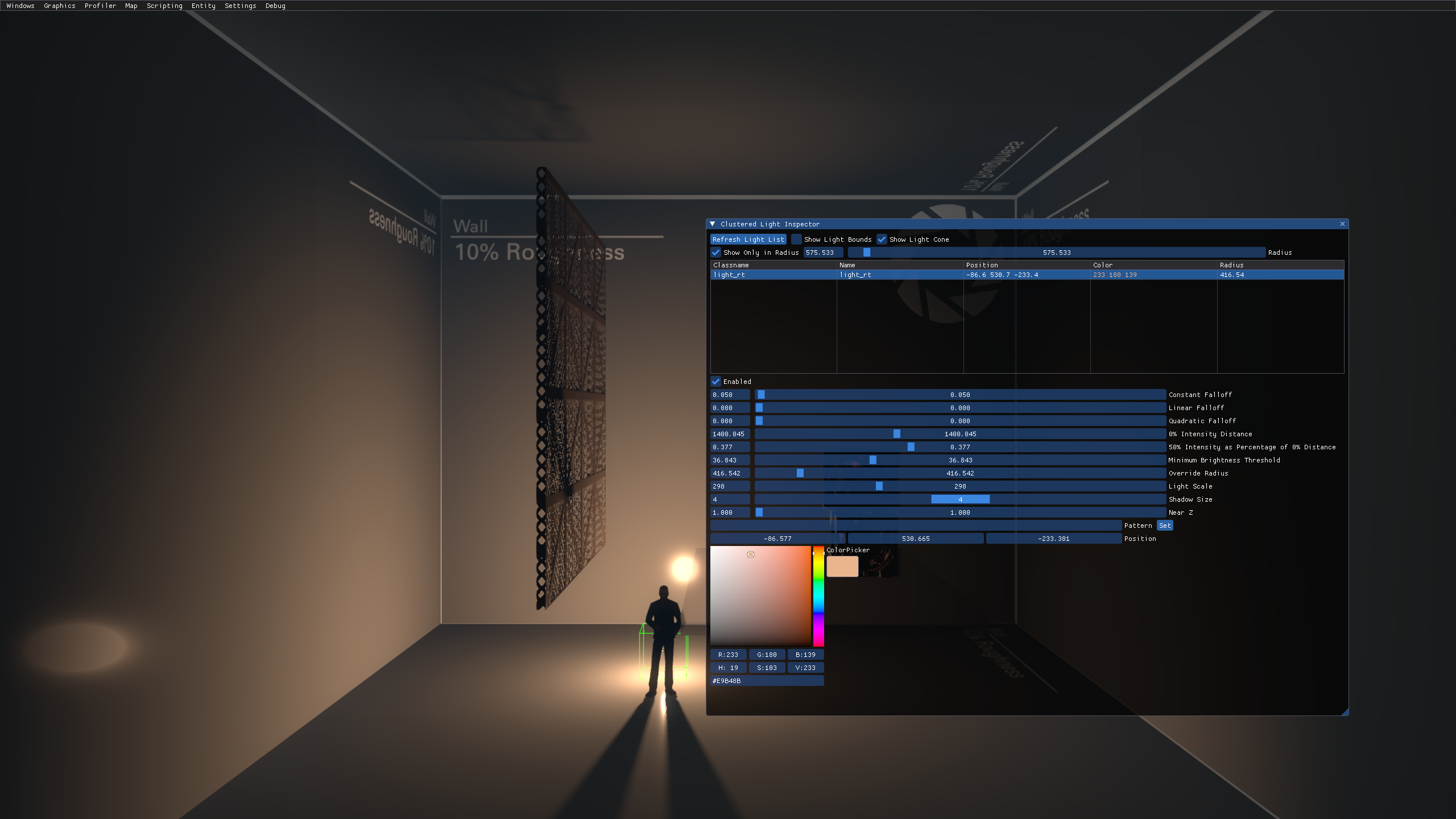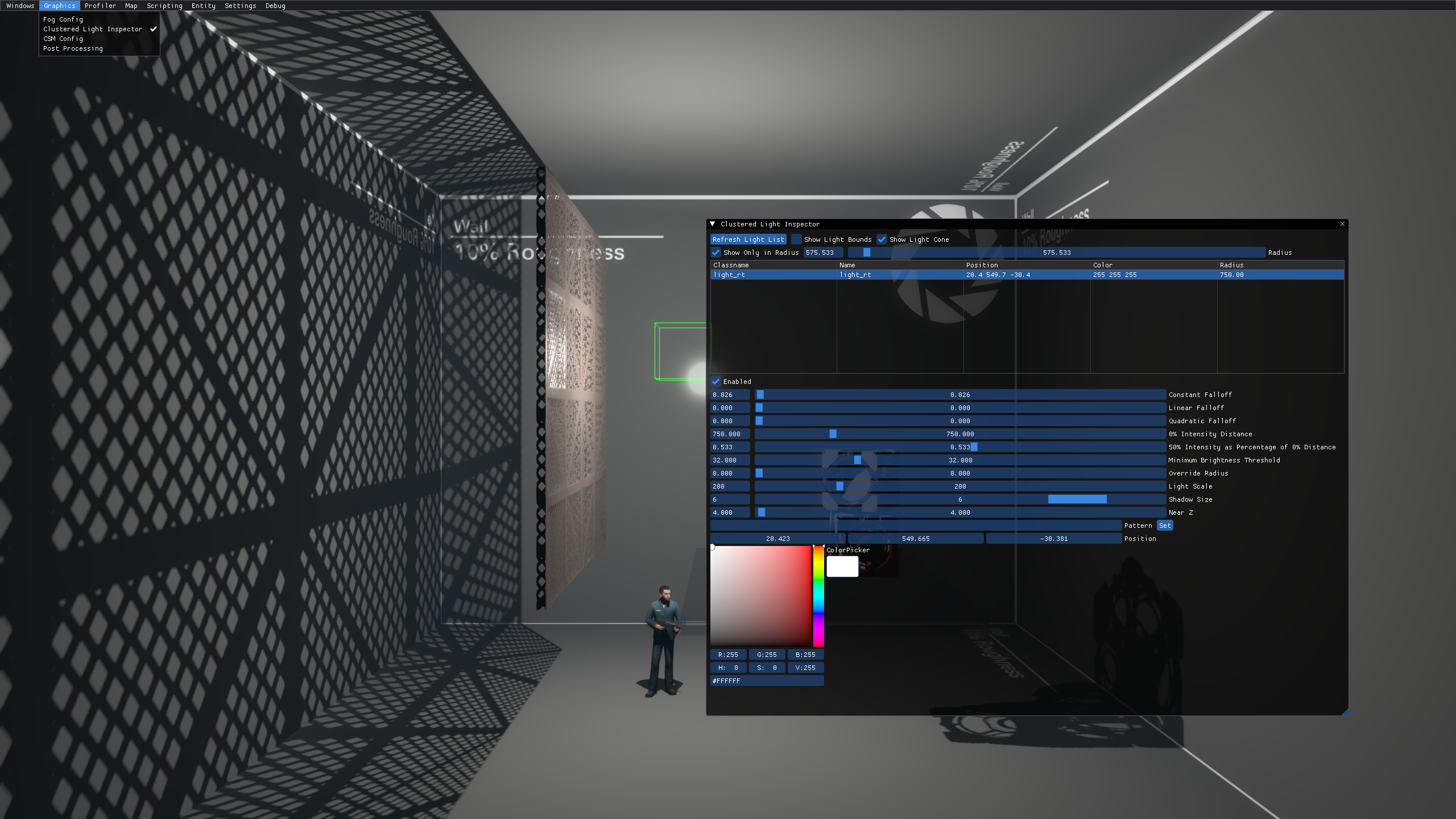 Clustered Light Inspector is a menu where you can control light_rt entities in real time in-game. There are various options that give almost a full control over the entity. You can control all the default light options, such as Constant, Linear, Quadratic, 0% Intensity Falloff, 50% Intensity Falloff, Minimum Brightness Threshold, Override Radius and Light Scale, as well as Color using the color palette, Shadow Scale, Near Z, light's Pattern and entity's position in the map.